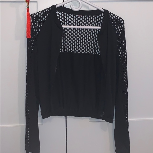 This stylish jacket is a sort of smooth fishnet material in the upper back, shoulders, and arms, with solid material on the stomach, chest and lower back. Tag was cut out but I hardly wore it