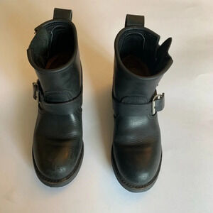 These boots are in good used condition gets better with age very comfortable . See photos for wear ie: some rust on buckles, scuffs. A small area with white dots possibly paint splatter not noticeable when on had to zoom in to show. I wear a size 8 and these fit me see measurements in photo