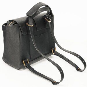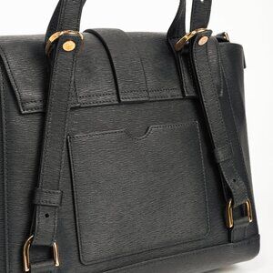 Made in Italy, this Midi Maestra backpack from Senreve is crafted in a black textured leather, and features gold-tone hardware, a flat top handle, adjustable shoulder straps, a back patch pocket, protective bottom feet, and a front flap with an adjustable strap closure. The inner zip closure opens to a greyish-blue microsuede interior containing a snap-closure tablet pocket, five slip pockets, one gusseted pocket, and one zip pocket.
