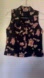 Sense blouse, in very good condition (one mismatched button (see photos). Light weight fabric, buttoned front, floral pattern, sleeveless design, v-neckline with ruffle detail. No material or size markings, see measurements.