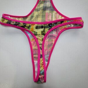 style : very sexy open front, triangle halter top, contrast binding on all edges, matching ring at centre of top connects the top and bottom together, thong back, skimpy fit, lined crotch