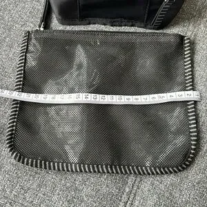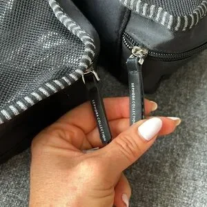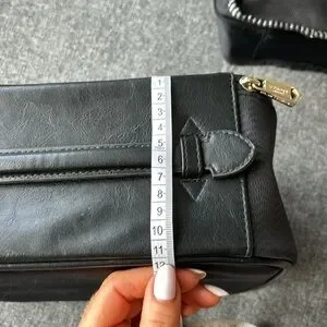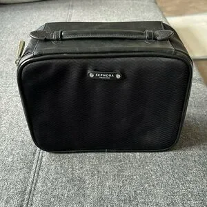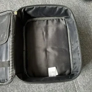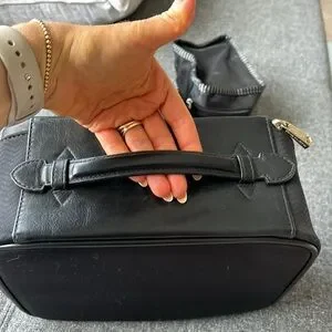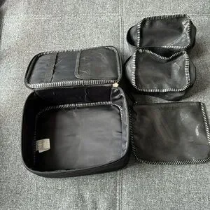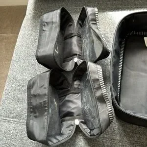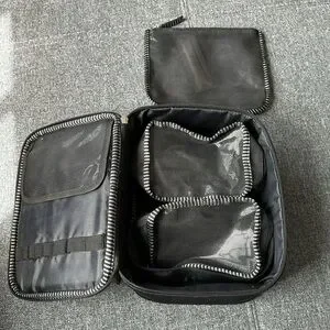 Travel make up bag in black with silver detail. Comes with 3 separate pieces, 2 larger cases and I flat case. Also has a section for brushes. Great for travelling, fits make up, brushes, skin care, liquids. Can also be used without the inserts. Zipper closure.