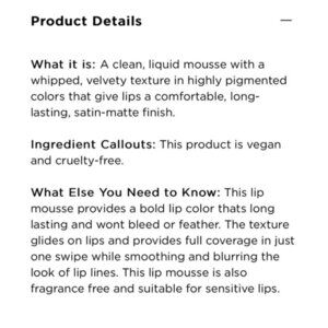 A clean, liquid mousse with a whipped, velvety texture in highly pigmented colors that give lips a comfortable, long-lasting, satin-matte finish.