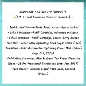 This lot includes a range of body care and bath items from reputable brands including Tree Hut, Yves Rocher, Schick Intuition, Touchland, and more.