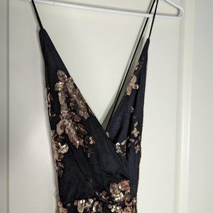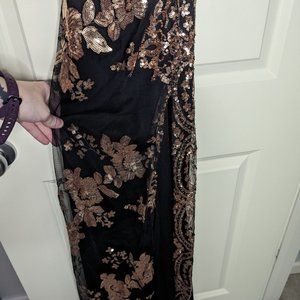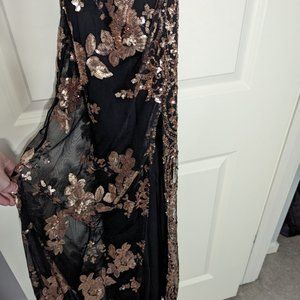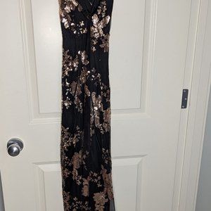 Full length black bodycon dress with sheer layer of rose gold sequins in a floral pattern. Never worn, size small.