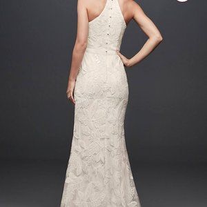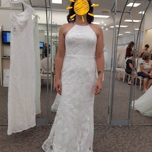 Beautiful dress... never worn, only tried on. Rhinestone belt was added and can be removed. Destination wedding cancelled because of pandemic. Now it does not fit me. Has been stored in a bag.