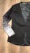 Sequin Sleeved Black Blazer in measured size medium. Pit to pit is 22 inches. 28 inches long. 24 inch sleeves. Functional front pockets. Lined. Darting in front and back for flattering fit. Faux leather trim on collar. Unbranded and no size/fabric tag. In excellent condition.