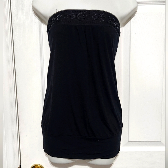 This chic black strapless top is a must-have for your wardrobe. Its sleek and stylish design ensures a flattering fit for any occasion.