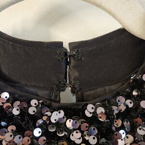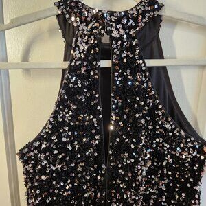 purple-silver sequins, halter neck line - 2 clips at back, semi-open back, above knee length - straight hemline, elastic waist, worn once - like-new condition