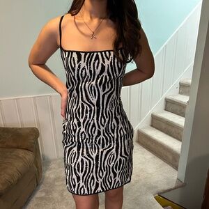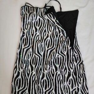 Mini, Black and white sequined, zebra print dress. Cross back.