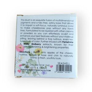 The Seraphine Botanicals Soft Sculpting Blush in Seashell offers a natural, luminous flush with infusion of periwinkle and white mulberry extracts. Perfect for layering with creams or powders.