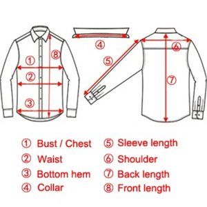 (1)Bust/Chest- 22" / (2) Waist- 22" / (3)Bottom hem- 18" / (4)Collar- 14.5" / (5)Sleeve length- 24" / (6)Shoulder- 19" / (7)Back Length- 26" / (8)Front Length- 28"