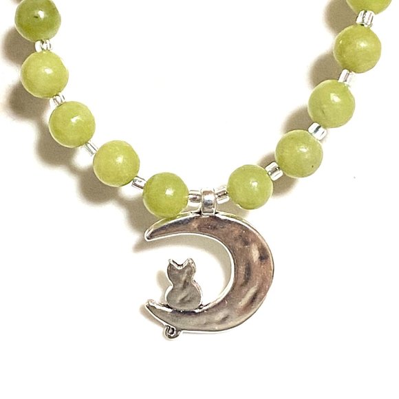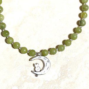 Serpentine Silver Cat on the Moon Necklace, Genuine Gemstone Beaded Necklace