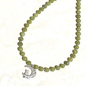 Serpentine Stone Silver Cat on the Moon Necklace, Genuine Gemstone Beaded Necklace