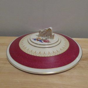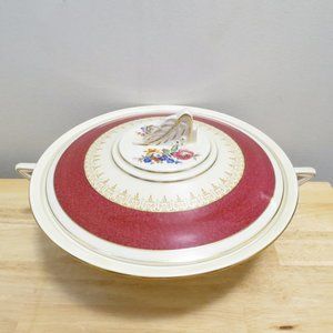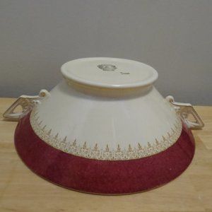 Add a touch of vintage charm to your table with this stunning two-piece serving bowl tureen with lid by Burgess & Leigh Burleigh Ware. Made of lead-free earthenware, the round bowl measures 9 inches in diameter and 5 inches in height, perfect for serving soups or stews. The burgundy bands, golden filigree and trim, and floral spray design give it an elegant and sophisticated look that will impress your guests on any occasion. This original early 20th-century piece was manufactured in England between 1930 and 1939 and has a printed backstamp. Hand wash only and avoid using abrasive materials. A must-have for collectors and lovers of fine pottery, this serving bowl tureen will make a great addition to your tableware collection.