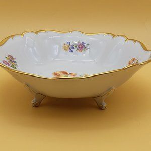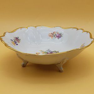 A centerpiece serving bowl made by Graf Von Henneberg in Jlemenau, Germany between 1934 and 1949 in amazing condition. The gold trim seems to be completely intact, as are the floral designs in purple, orange, blue and yellow in the interior. A rare find in that most of what comes to market is from the communist years. I packed it away before measuring it but the width is about 10 1/4" in diameter.