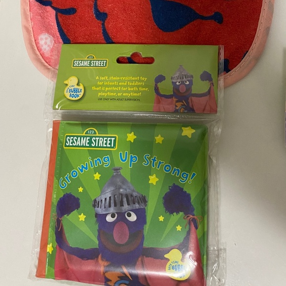Sesame Street baby bundle with one bib, a bath book, and 2 packages of 3 wash clothes. All new in package.