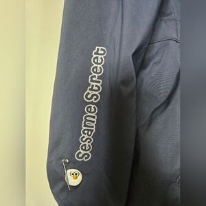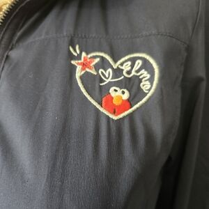 Adorable Sesame Street jacket. Elmo loves to play golf on back shoulder and cute elmo on the front chest. Full front zipper closure. Two snapped front pockets that geature a tiny elmo swinging a club. Cinchable waist.