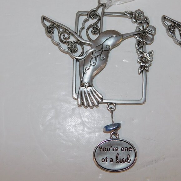 This set of 2 Different Ganz Trust Your Wings Hummingbird Inspirational window ornaments are both in great clean condition. One ornament has hanging words saying "You make life beautiful" while the other ornaments says "You're one of a Kind" . Each ornament is appros 4.5" long from top to bottom of hanging word oval and 3" at the widest part. One side of each ornament is all metal while the other side has turquoise, teal white inlay detail. Beautiful display pieces for the hummingbird lover in your life.
