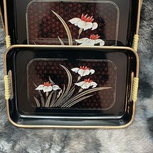 Set of 3 black serving trays with elegant floral design. Features gold accents and handles.vintage and on very good condition with some minor scratches Made in Japan.