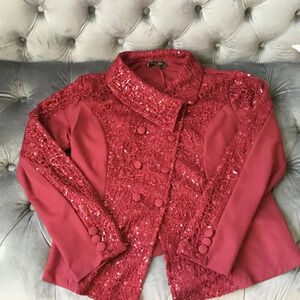 • Design Elements: Lace overlay with sequins on the jacket, fabric-covered buttons, structured collar
