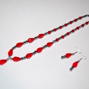 Set Necklace and Earrings,Glass Beaded Earring and Necklace,Red and Silver Color