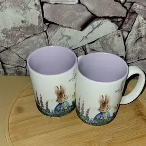 Set of two ceramic mugs featuring Peter Rabbit design. Perfect for tea or coffee lovers.
