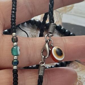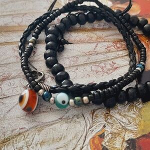 set of 3 bracelets 2 are leather and have an evil eye bead