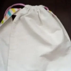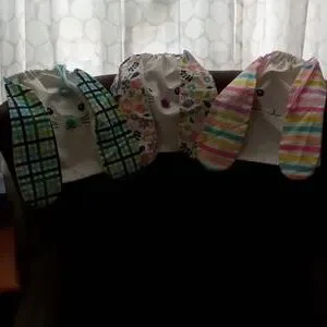 White bags with blue, purple and pink pull ties and matching long ears.