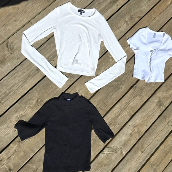 purchased from stores such as aritzia. black and white top are size small, long sleeve white top is xsmall. in new condition