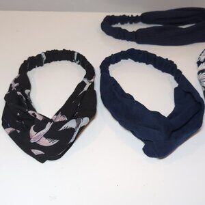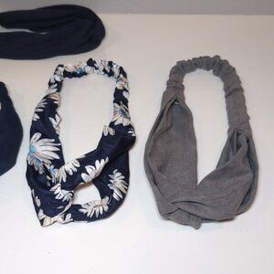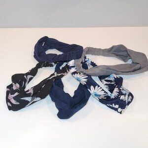 A coordinated assortment of fashion hairbands, perfect for workouts, yoga, messy buns, and casual everyday wear. In a blue, black, and gray palette, this set includes two microsuede, ribbed, crepe, and satin fabrics, in solid, floral, and bird prints. The bands can be adjusted to be worn wide or tucked under to be slimmer. They have comfortable fabric covered elastics for all day wear.