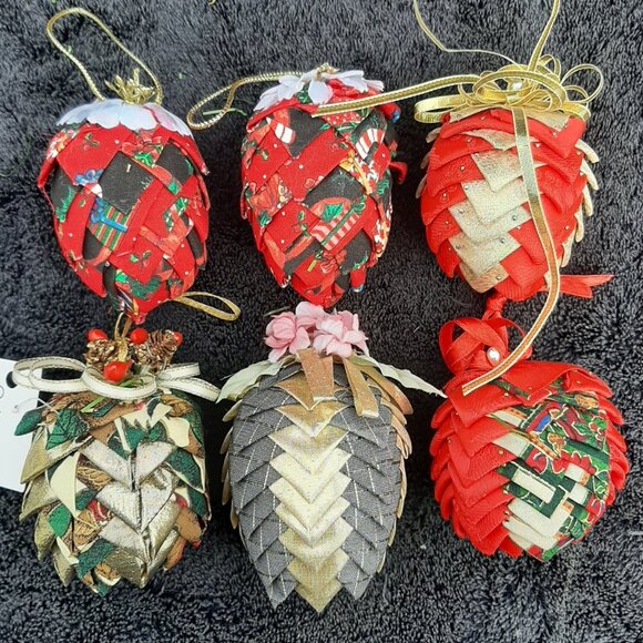 Set Of 6 Handmade Folded Fabric Pine Cone Ornaments Holiday Decor Red Gold Green