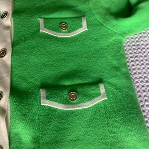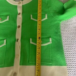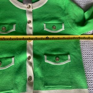 ✨ The vibrant Kelly green cardigan features contrast cream trim, four front pockets, and luxe button details — “Old Money” vibes.