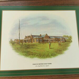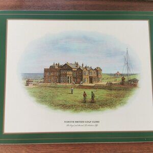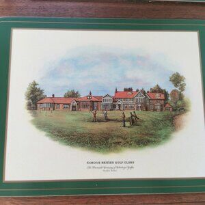 Set of 12, English Pimpernel 6 Placemats and 6 Coasters of Famous British Golf Clubs, Including The Royal Liverpool Golf Club, The Honorable Company of Edinburgh Golfers, Troon Golf Club Troon Ayrshire, Royal Lytham and St. Anne Golf Club, The Royal and Ancient St. Andrews Fife, and The Royal St. George's Golf Club, have Gilding around the edges, Cork backs, made in England, and all have their original Pimpernel stickers on the backsides. Very Good Vintage condition, one light scuff mark on The Liverpool Mat shown in pictures, no damage to any placemats or Coasters, light wear on boxes. Placemats are 12 inches in length and 9 inches in width, coasters are 4 1/8 inches square. Please see pictures for further details