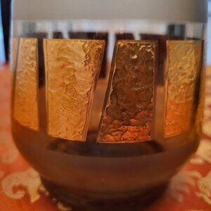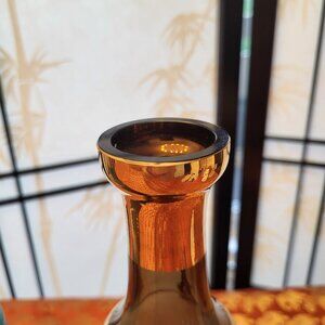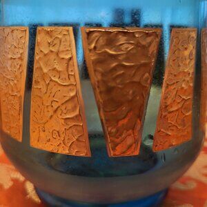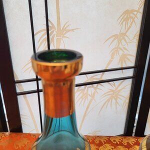 Elevate your barware collection with this set of two Bohemia decanters, a stunning tribute to the sophistication of the 1960s. Crafted with care, these decanters showcase a rich cobalt blue and brown finish, accented with elegant gold gild details. The atomic pattern exudes a timeless Mid-Century Modern charm, perfect for any vintage-inspired entertaining setup. Each piece is a testament to the era's craftsmanship, originating from the United States and dating back to the years 1960-1969. The matte finish and studio-crafted production style ensure that these decanters are not only decorative but also functional, complete with a lid/stopper to preserve your beverages. Add a touch of mad men flair to your gatherings with these handmade glasses that celebrate the best of mid-century design.