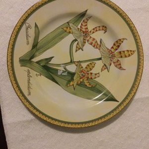 It is a set of two American Atelier Botanical Salad dessert stoneware plates with a Prosthechea Cochleata orchid flower design. the plates are oven dishwasher and microwave-safe. It is 21cm in diameter and in very good pre-owned condition. Please check the pictures for details.