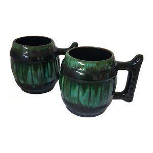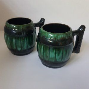 Set of 2 Blue Mountain Pottery Barrel Mugs Green Black Drip Glaze Mugs Teacups