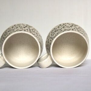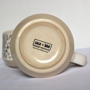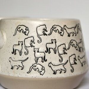 Adorable set of 2 Stoneware cat mugs by Coco & Lola. Off white/cream speckled mugs feature embossed black outlines of cats in different poses - a great gift for any cat lover! Base is a beige color and each mug stands approx. 3" tall. Pre-owned with some minor signs of wear but in great condition - no cracks or chips. Smoke-free, pet friendly home!