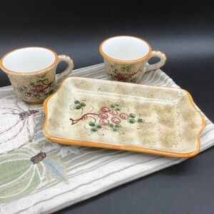 Start the morning by drinking your espresso in these 2 Beautiful Italian Espresso Coffee Cups and Tray with Grapes design. Marked B.A.Deruta. Accompanied by this beautiful Tea Towel from Pier One with Pumpkins design.