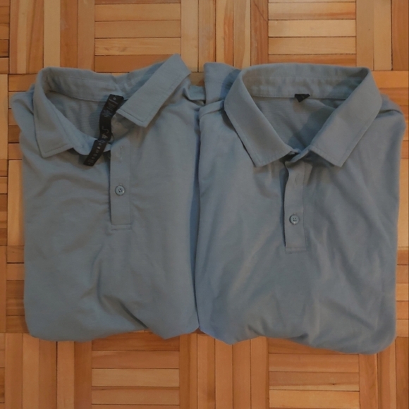 Set of 2 Lululemon men polo size L, one had some embroidery removed, lightly show was stiches on a front. another one has small wholes on a shoulder. armpit to armpit is 21", length is 27".