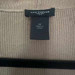 • Ann Taylor ribbed waterfall cardigan in a classic camel tan, size XS — soft knit, draped front, timeless and versatile.