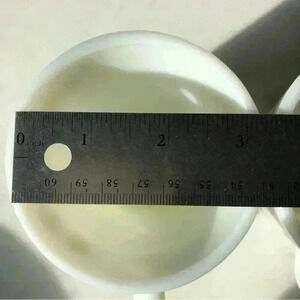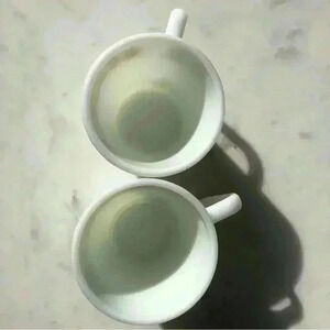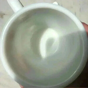 This pair of preowned heavy milk glass mugs are in good used condition. One has some wear to the interior glaze. Both are free of chips and cracks and have minimal paint wear.