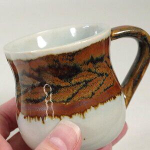 This is a set of 2 Mexican Tonala Pottery Mugs from Ken Edwards Studio. They have a grey background with a brownish copper band around the body of the mug and handle. The band has a chevron pattern in it. The bottoms are faded, but say "El Palomar KE Mexico " along with the cartouche of the artist that did the hand painting.