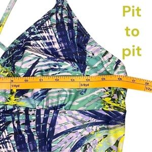 1. Tropical palm print one piece swimsuit with v-neck and strappy straps. Colours are turquoise, lavender, navy and lime green.