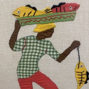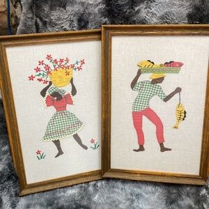 Very good condition. Rare Set of two framed textile art pieces. Features vibrant folk art designs. Perfect for adding a cultural touch to any room.