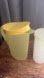 Vintage 1980s Yellow Juice Pitcher with Rock Lid (holds 2.1L 8 3/4 cup stamped on bottom). Measures approx 9 1/4 inches tall, 7 inches long and 3.5 inches wide. The lid tilts back and forth to open and close the spout.