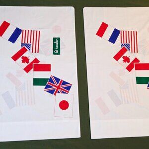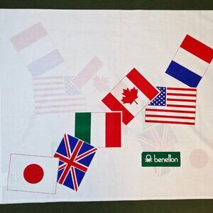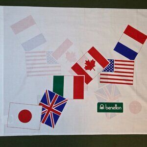Rare vintage pillowcases by Benetton, featuring a vibrant international flag design with six national flags: USA, Japan, Canada, France, United Kingdom, and Italy – a stylish nod to global unity and classic 90s design.