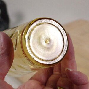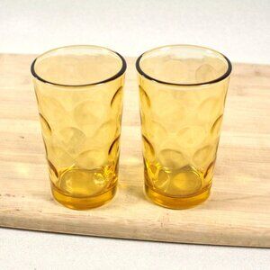 Set of 2 vintage juice glasses by the Hazel Atlas /Continental Can Company in their thumbprint pattern in Honey Gold Eldorado. It has been described as raindrop dots inside of glass. They are roughly 3 3/4" tall and 2 1/4" wide. No cracks or chips.