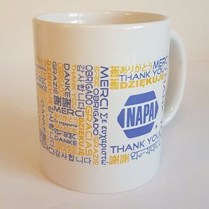 Tags: #2307 Home, Dining, Mug, Kitchen, Drinkware, Cup, Teacup, Coffee Cup, Coffee Mug, Vintage, Collectible, Retro, Canada, Store, NAPA, Auto, Autoparts, Automotive, Automobile, White, Blue, Yellow, Thank you, Language