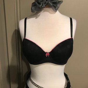 1. Betsey Johnson's adorable demi-cup bra has a subtle tone-on-tone polka dot mesh and hot pink accents. Single-layer only slightly padded, 34D, perfect condition. Regular retail $50